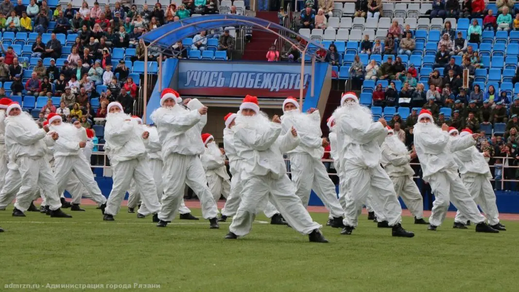 На поле стадиона «Спартак» вышли десантники в белоснежном зимнем камуфляже и красных колпаках. Курсанты исполнили зажигательный танец, показали акробатические трюки и пронесли флаг «Рязань — Новогодняя столица».