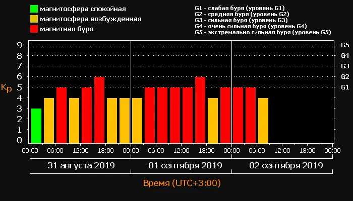 Началась буря в субботу, 31 августа, продолжилась в воскресенье, а также утром в понедельник. Учёные прогнозируют, что сегодня во второй половине дня буря должна пойти на спад. Геомагнитная обстановка на Земле должна стабилизироваться к утру вторника, 3 сентября.