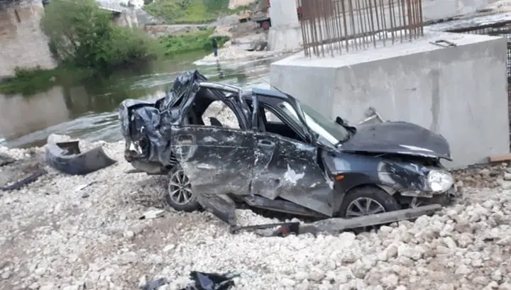 При просмотре кадров, которые опубликованы на сайте Вестей, можно заметить, как водитель черной Лады Приоры, проезжая по мосту на огромной скорости, теряет управление. Его машина выезжает на встречку, где врезается в уборочную технику. После этого легковушка пробила ограждение на мосту и упала вниз.