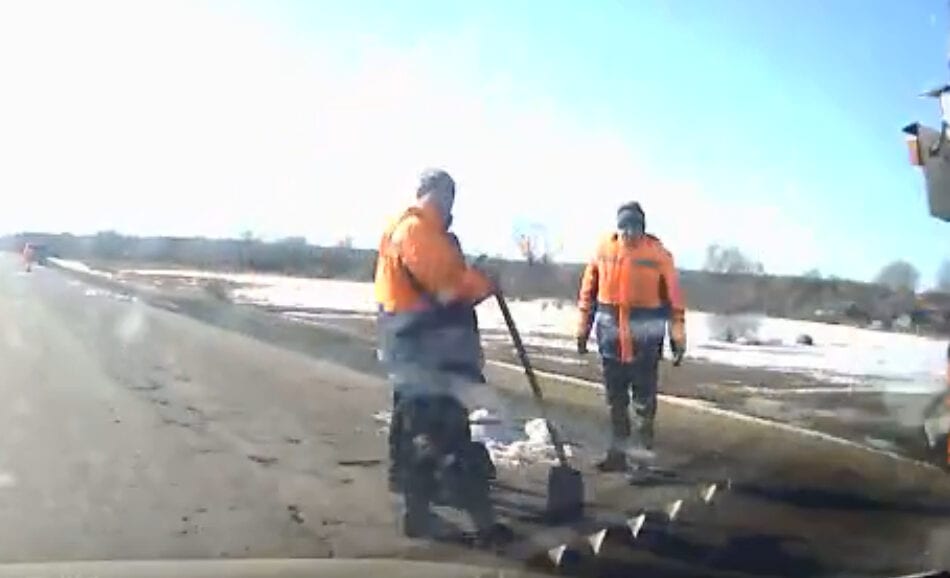 В Александро-Невском районе Рязанской области рабочие засыпали дорожные ямы снегом. Видеоролик опубликован группой Рязань.