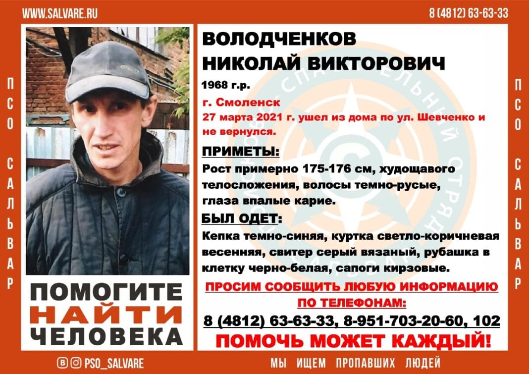 Володченков Николай Викторович ушел из дома 27 марта, но обратно так и не вернулся. Известно, что мужчина проживает на улице Шевченко.