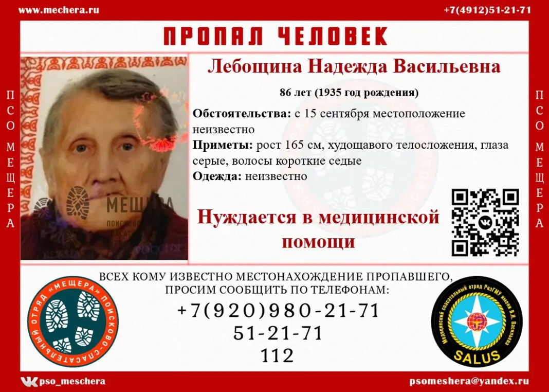 В Спасском районе Рязанской области ищут пропавшую 86-летнюю Надежду Васильевну Лебощину. Об этом сообщили волонтёры ПСО «Мещера».