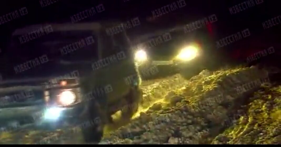Судя по ролику, на дороге образовалась снежная колея. Автомобили вытаскивают с помощью троса.