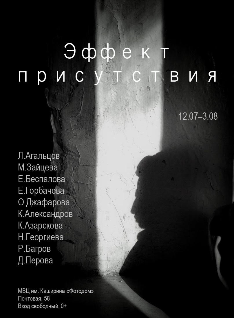 Выставка «Эффект присутствия» открыта в «Фотоном» (ул.Почтовая, д. 58) до 3 августа ежедневно, кроме воскресенья, с 10.00 до 19.00. Вход свободный, 0+.
