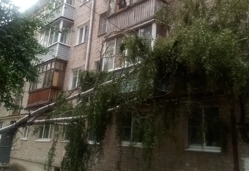 Во время урагана 14 июля большое дерево упало на пятиэтажный жилой дом № 75 по улице Свободы. Фотографии последствий непогоды разместила группа «Рязань».