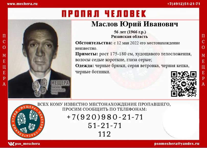 В Рязанской области пропал 56-летний Юрий Маслов. Ориентировку распространил в пятницу, 15 июля, ПСО «Мещера».