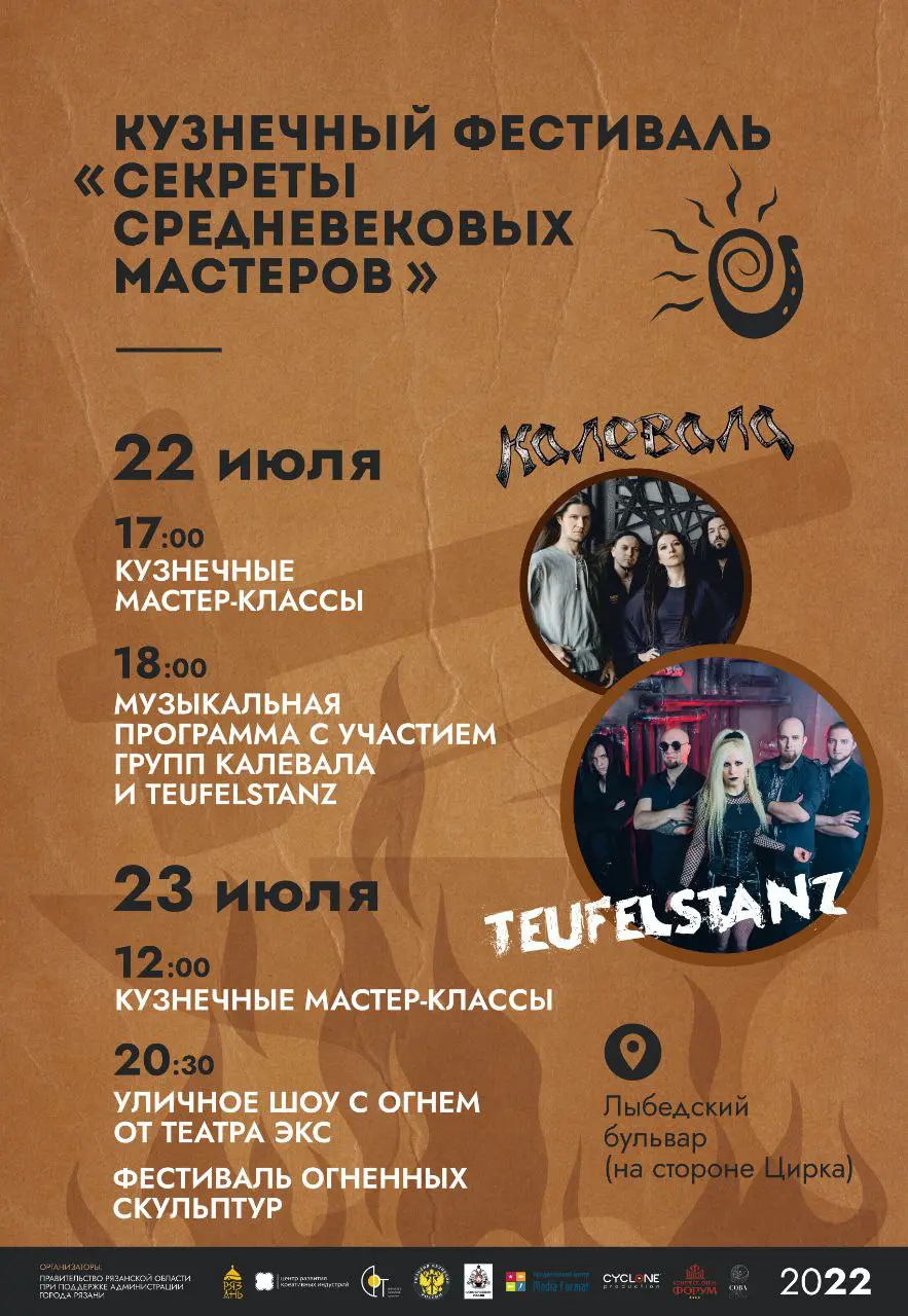 В пятницу 22 июля программа стартует в 17 часов. Пройдут мастер-классы по художественной ковке и созданию единой кузнечной композиции из готовых фрагментов. В 18 часов группы Teufelstanz (средневековая музыка) и «Калевала» (фолк-рок) представят музыкальную программу.