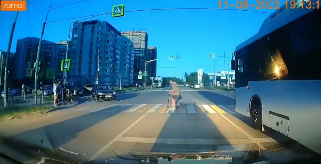 В Дядькове подросток на самокате пересёк проезжую часть на запрещающий сигнал светофора и чуть не попал в ДТП. Видео инцидента опубликовано в паблике ПУВР.