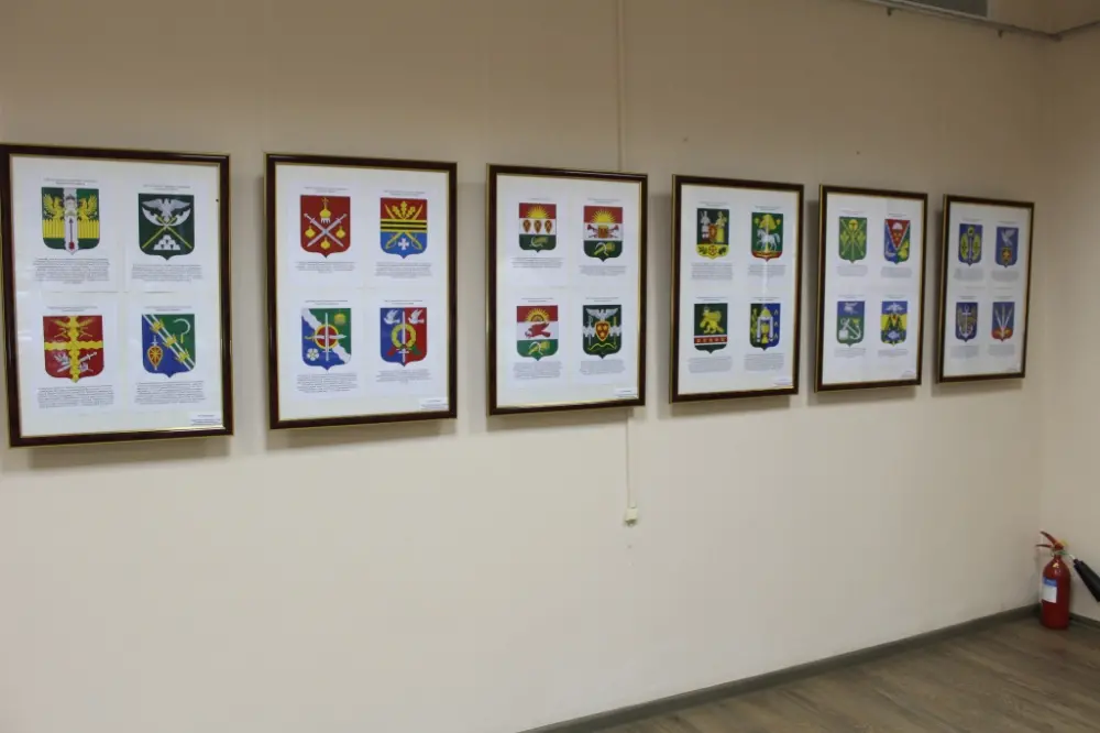 В экспозиции представлены гербы муниципальных образований РО, личные гербы, геральдические гравюры, офорты.