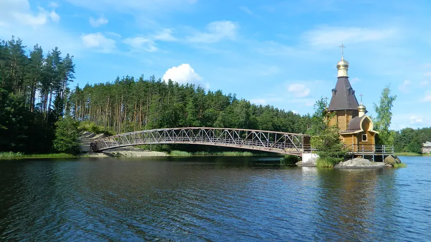 Храм построили на реке Вуокса в 2000 году. Это единственное в мире культовое сооружение, фундаментом которого служит монолитная скала.
