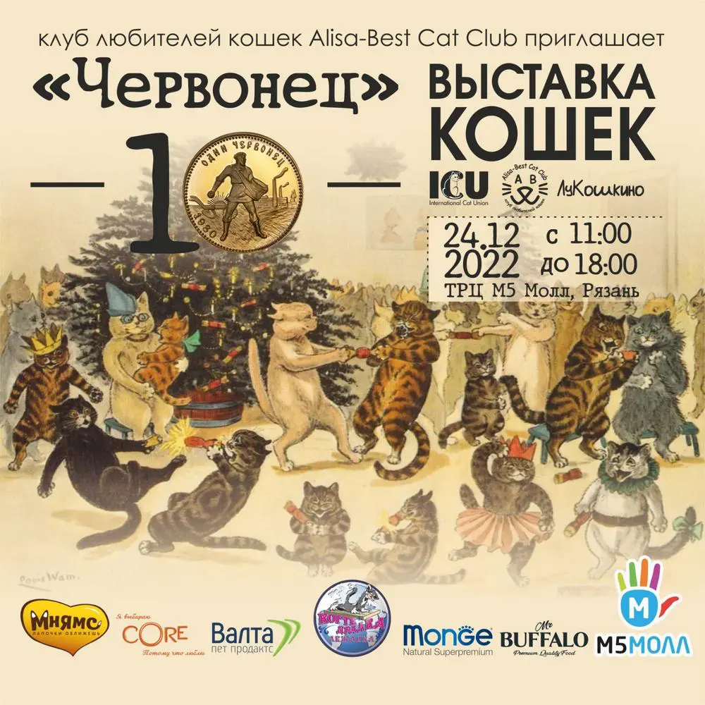 24 декабря в ТРЦ «М5 Молл» в Рязани пройдёт выставка кошек «Червонец», организованная клубом Alisa-Best Cat Club. Название кошачьего форума выбрано неслучайно—в этом году исполнилось 10 лет работы рязанского клуба в международной фелинологической системе ICU.