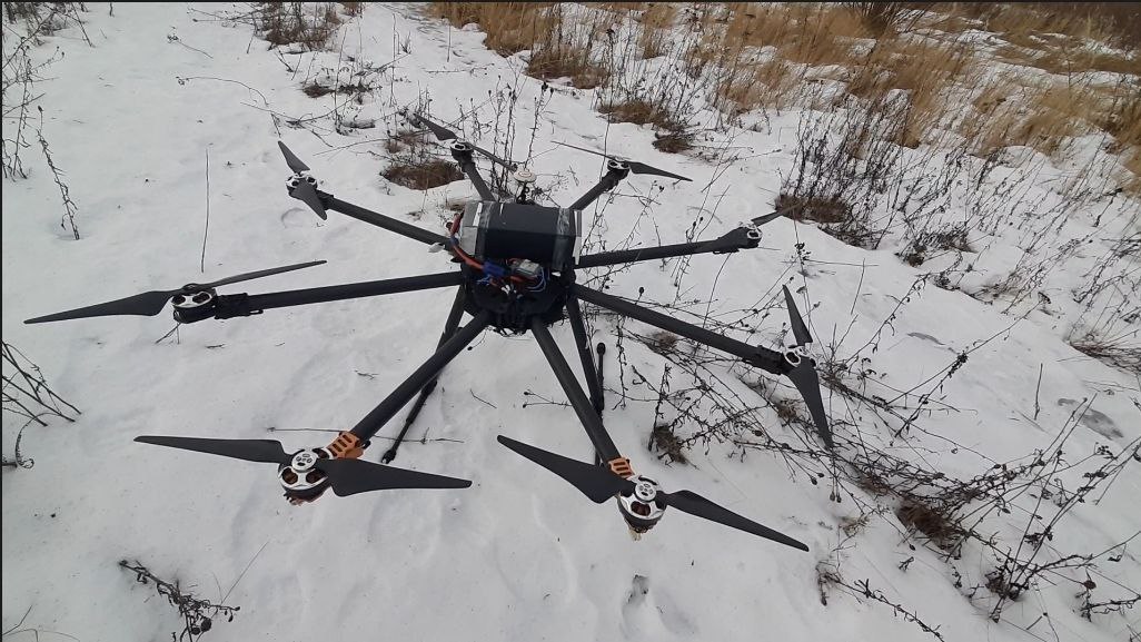 В рамках взаимодействия с конструкторским бюро был разработан дрон-тяжеловес, с рабочим названием «Бегемот». Основное предназначение коптера – перенос и сброс тяжелых грузов. На коптер установлено 2 камеры, системы сброса, радиодатчики, которые сложно перехватить вражескими системами РЭБ.