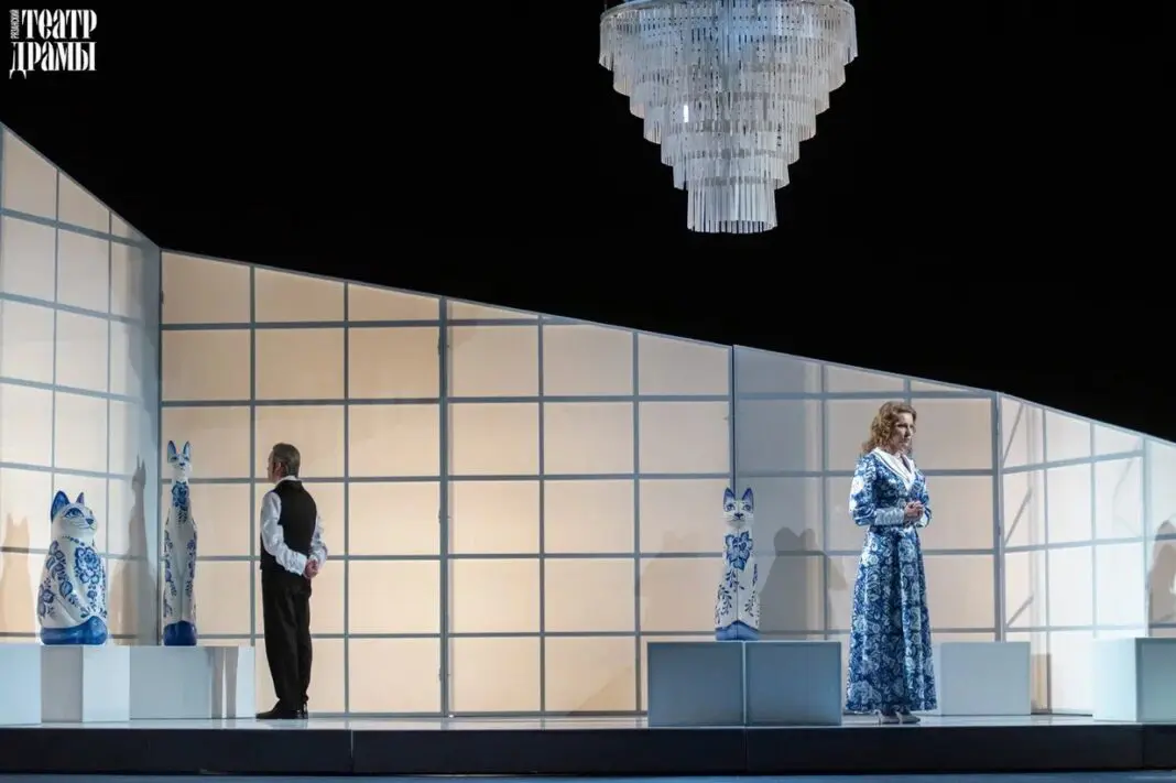 Белогубов же, наоборот, обзавёлся жилетом «под гжель», только после того, как добился расположения начальства. Его невеста Юленька резка, стремительна и лишена каких-либо романтических иллюзий. Она точно знает, чего хочет, расчётливо демонстрирует фигуру в облегающем чёрном наряде и незамедлительно требует платы за свою любовь. Выйдя замуж и разбогатев, Юленька сразу же наряжается в бело-голубые наряды, которыми не может похвастать её сестра. В дорогое платье с гжельскими узорами облачена и жена Вышневского (Марина Мясникова), которую он купил у родственников, как дорогую, статусную вещь, как одну из фарфоровых статуэток на тумбе.