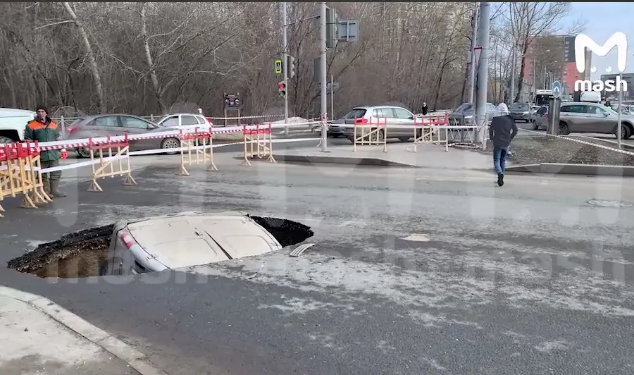 По предварительным данным, асфальт провалился в месте прорыва канализации, размывшей грунт.