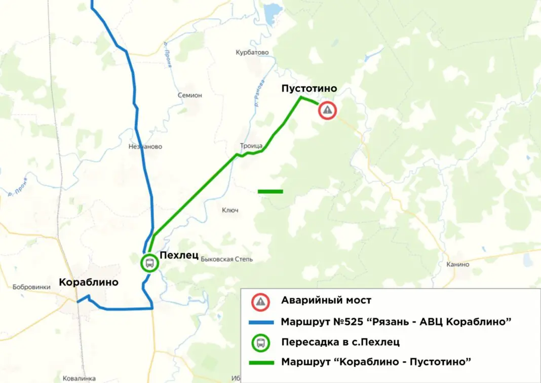 — пересадка в с. Пехлец на муниципальный маршрут «Кораблино — Пустотино» (3 раза в неделю по 3 рейса в день).