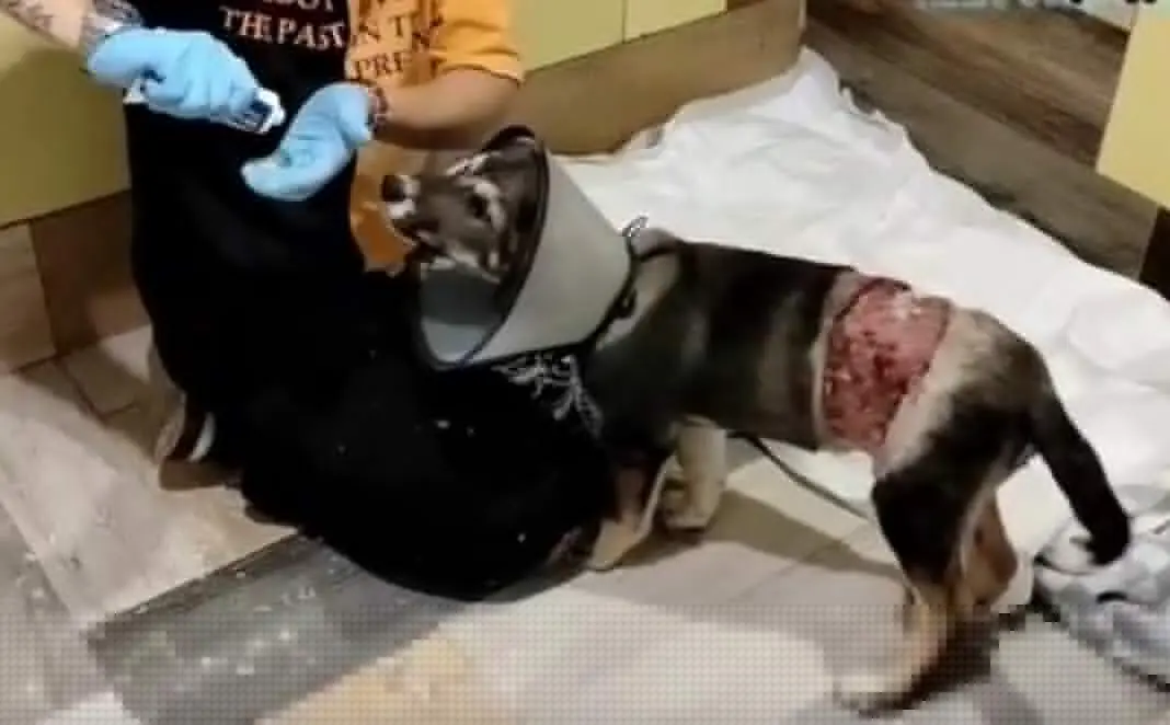 У собаки срезана часть кожи в районе задних лап. Волонтёры надеются, что живодёра найдут и накажут.