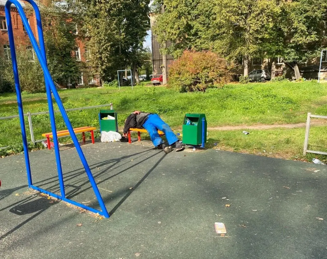В Рязани «после бурной ночи» двое мужчин уснули на детской площадке. Снимки опубликовала группа «Рязань Online» ВКонтакте.