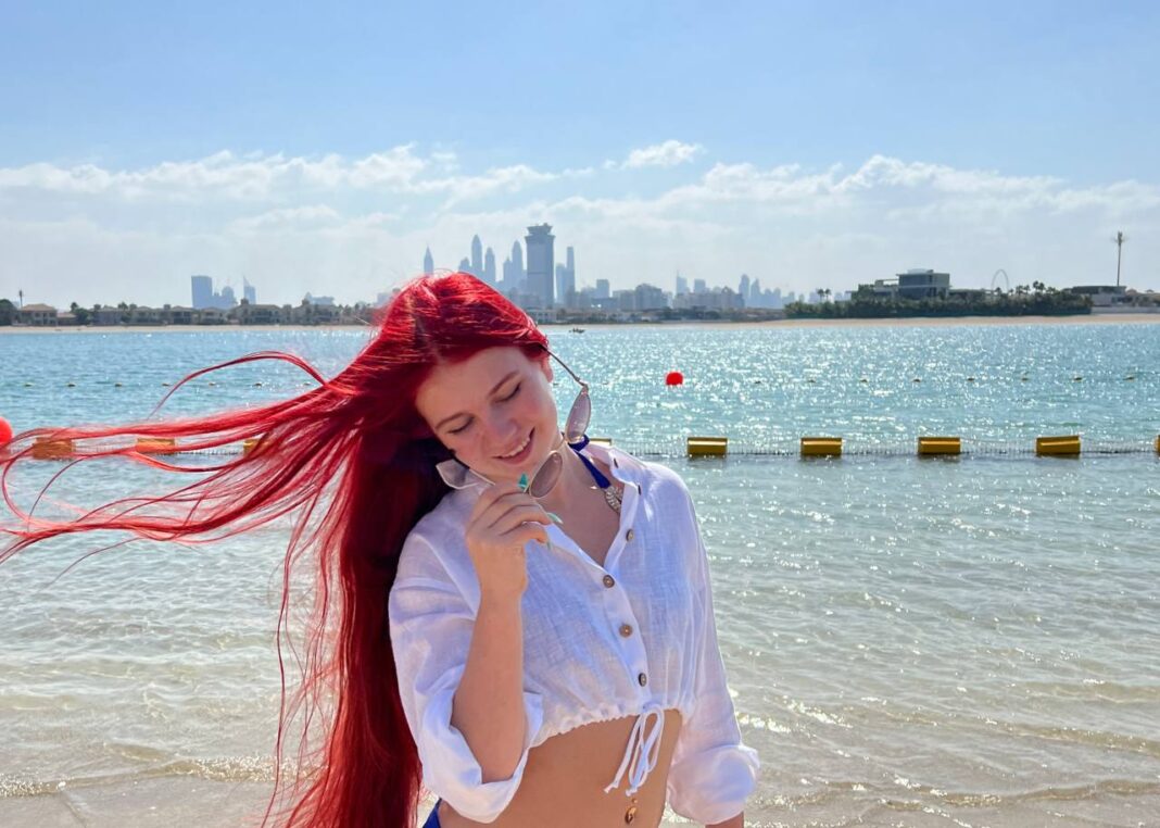 Сейчас Александра находится на отдыхе в Дубае. На снимках она позирует на пляже, ещё одно фото сделано под навесом.