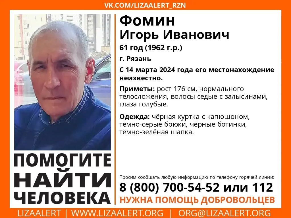В Рязани бесследно пропал Игорь Фомин 1962 года рождения. Ориентировку на 61-летнего местного жителя распространил вечером 14 марта поисково-спасательный отряд «Лиза Алерт».