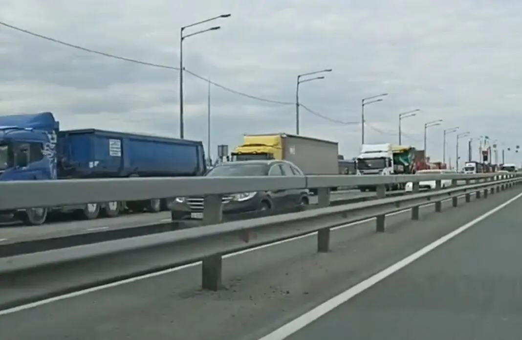 По словам автора поста, причина такой пробки из грузовиков объясняется наличием машины дорожного контроля у поста ДПС.