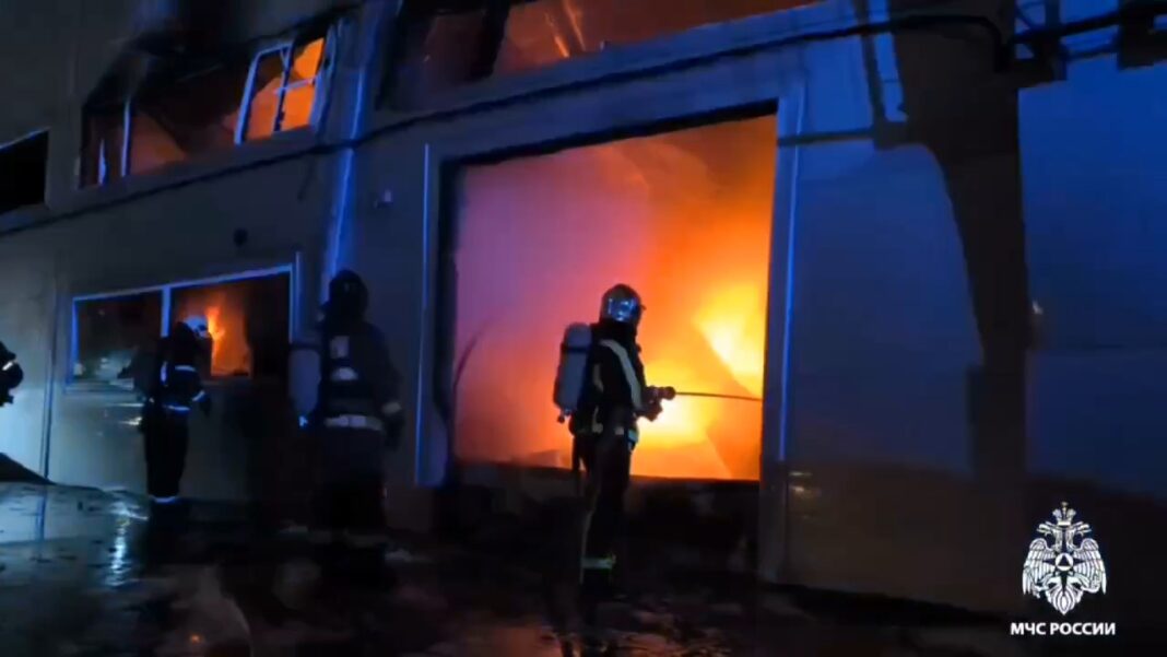 В хуторе Ветряк горит пристройка к автосалону, площадь пожара оценивается в 1600 квадратных метров. Существует угроза дальнейшего распространения пожара.