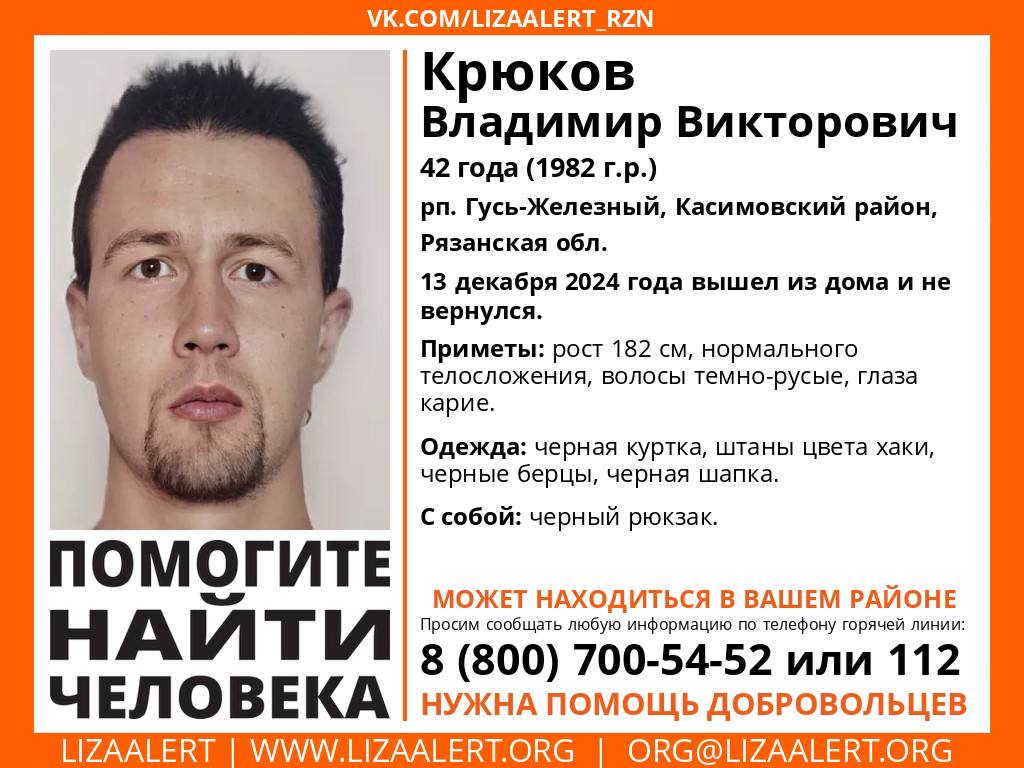 В Рязанской области разыскивают 42-летнего Владимира Крюкова. Мужчина вышел из дома 13 декабря и не вернулся. Об этом сообщает телеграм-канал «ЛизаАлерт».