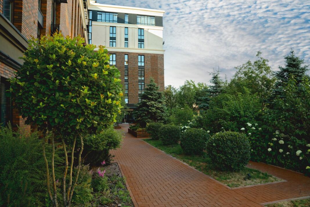 Озеленение территории является неотъемлемой частью формата «двор-парк», который девелопер реализует во всех своих проектах. Благоустройство осуществляется в концепции «4 сезона». Такое решение обеспечивается благодаря правильно подобранным растениям: хвойные украшают придомовую территорию зимой — голубые ели и обыкновенные ели, туи и можжевельники, а с наступлением весеннего тепла парк наполняется цветением декоративных яблонь, сирени, ирги и боярышника. Летом расцветает астильба, ирисы, декоративнолиственные дерены, хосты, мята и катовник, а осенью наиболее эффектно смотрятся злаковые растения, краснолистные клены, крупноягодные боярышник и рябина.