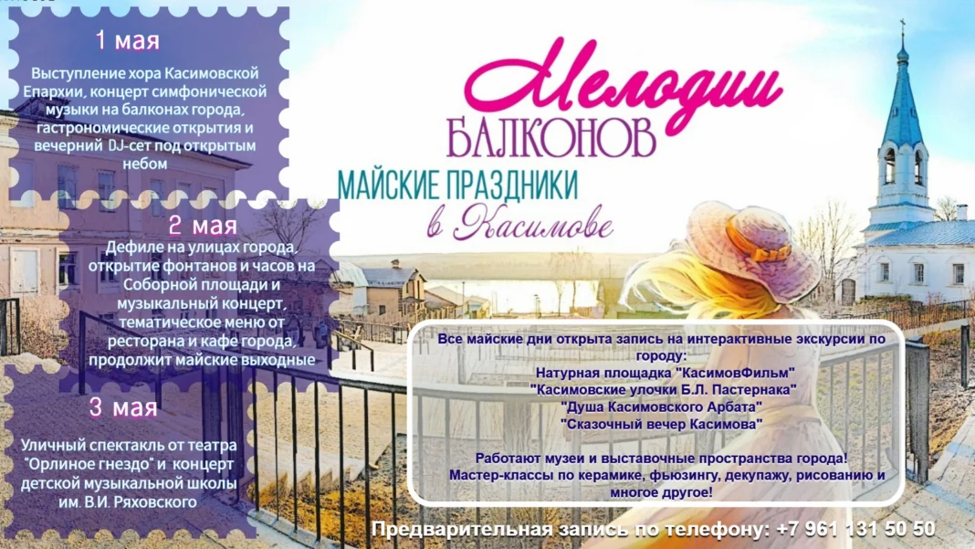 С 1 по 3 мая в Касимове пройдет праздничная программа «Мелодии балконов», приуроченная к началу мая. Горожан и туристов ждут концерты, гастрономические открытия, уличные спектакли и тематические экскурсии. Об этом сообщает местный ентр развития туризма.
