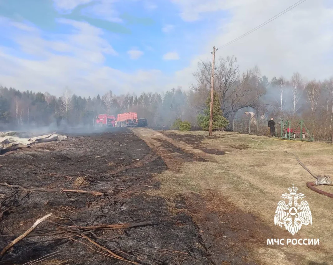 В 13:38 поступило сообщение о пожаре в деревне Петряево. К моменту прибытия пожарных горели несколько строений и сухая трава.