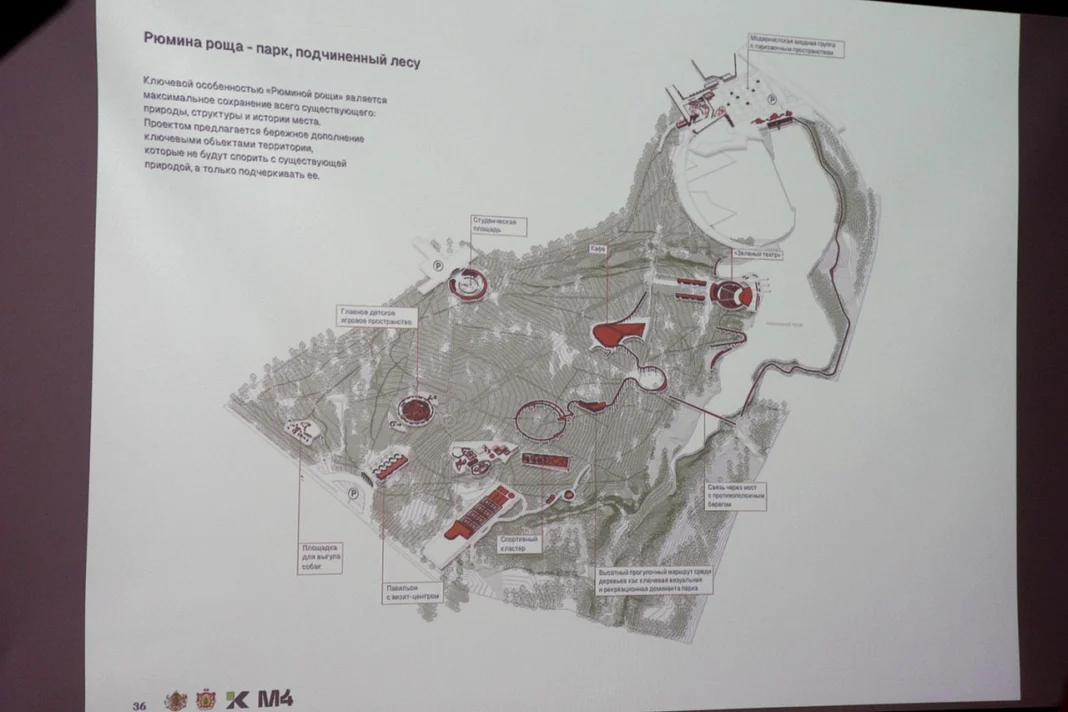 Руководитель архитектурного отдела Проектного бюро «М4» Виктория Симакова подробно рассказала, как велась работа над проектом — какие применялись принципы и подходы для формирования образа такой большой территории. «Рюмина роща — парк, подчиненный лесу» — так звучит основная идея, которая легла в основу благоустройства парка.