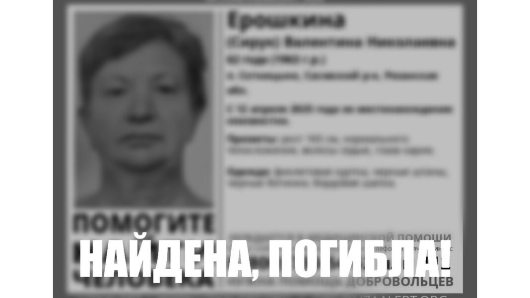 Валентина Ерошкина пропала 12 апреля 2025 года. Отмечалось, что женщина нуждалась в медицинской помощи.
