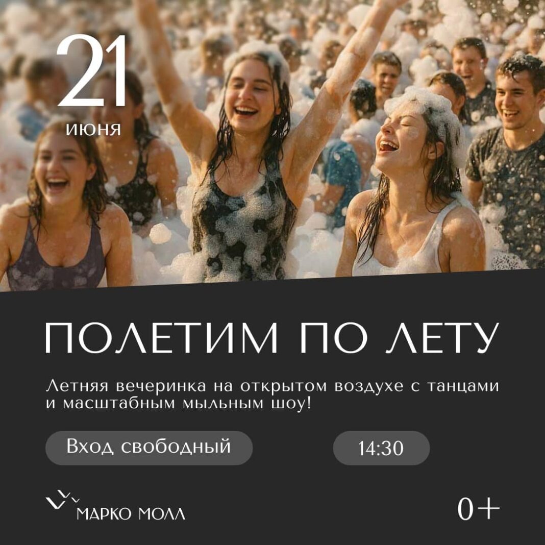 Анимационная программа «Полетим по лету» — праздник для активных и творческих горожан с вокальными состязаниями, танцами, увлекательными конкурсами, дартсом с воздушными шарами и мастер-классом, где научиться рисовать можно с помощью необычного для живописи материала — шерсти. В этот день каждый участник «летнего полёта» в «Марко Молл» сможет не только от души потанцевать и исполнить любимые песни, но и искупаться в пенных сугробах — весело и по-летнему.
