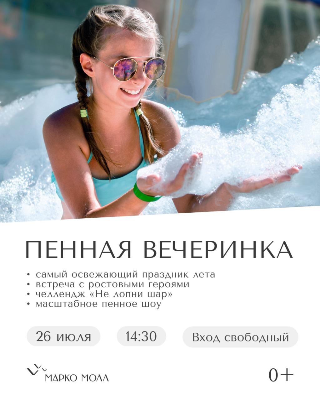 26 июля ТРЦ приглашает любителей самых летних и свежих впечатлений на веселую и увлекательную пенную вечеринку, где каждый гость получит море удовольствия. На празднике можно все: поиграть с друзьями в разноцветных пузырьках, окунуться в море белоснежной пены, и за эти маленькие шалости юных участников мамы точно ругать не будут! На этот летний праздник можно и нужно брать родителей с собой!!!