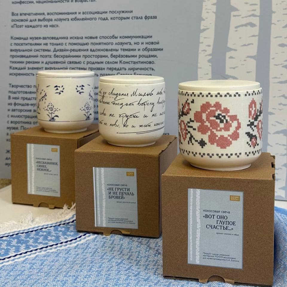 Сувенирную продукцию решили пополнить в юбилейный год поэта. При создании концепции художники опирались на мемориальные предметы из фондов музея-заповедника, образы, связанные с жизнью Сергея Есенина, и произведения поэта.