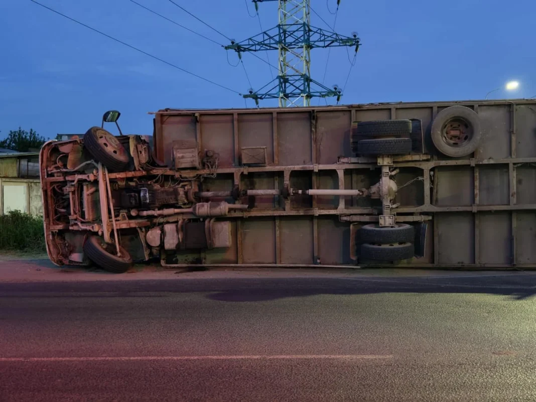 На окраине Рязани опрокинулся грузовик. Фотографию с места происшествия ночью 31 июля опубликовала группа «Подслушано у водителей Рязани» ВКонтакте.
