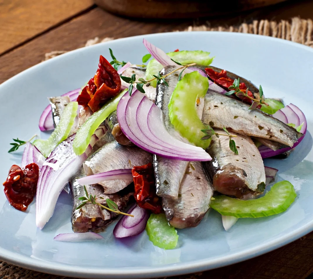 Чтобы приготовить закуску «Помаранция», нужно почистить кильку пряного посола, разделить ее на длинные полоски. Затем нарезать произвольными дольками вкусные помидоры, можно для цвета не только красные, но и жёлтые, мелко нарезать зелёный лук. Всё смешать, заправив растительным маслом.
