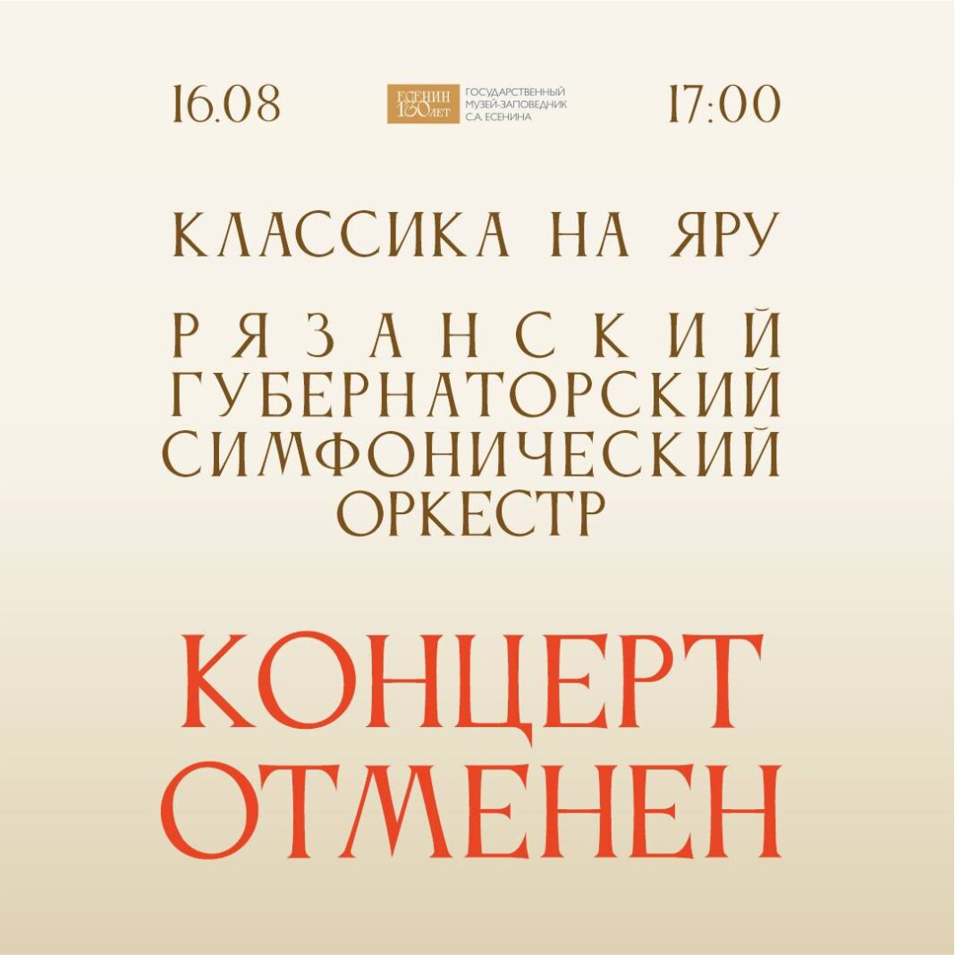 Концерт Рязанского губернаторского симфонического оркестра, запланированный 16 августа в музее-заповеднике в Константиново, отменен в связи с ЧП в Шиловском районе Рязанской области. Об этом сообщается в соцсетях музея.