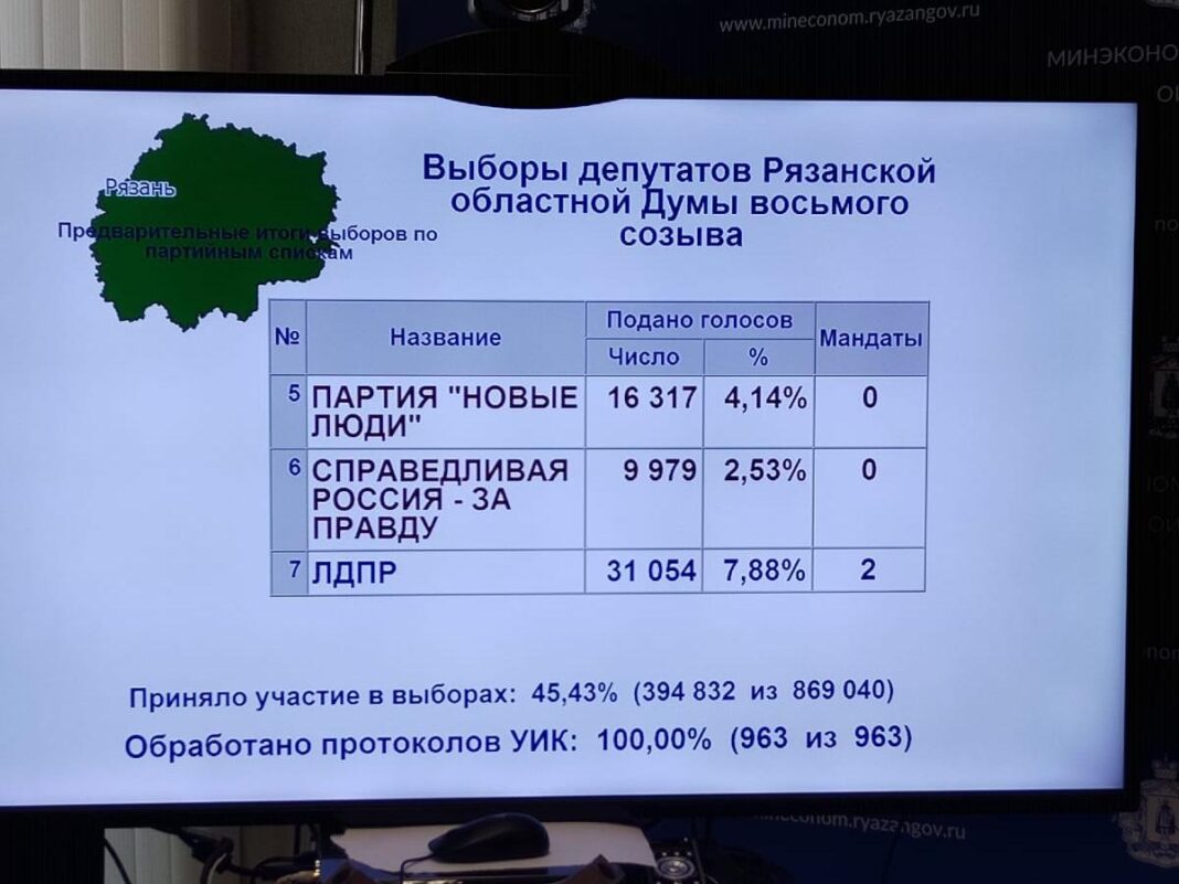 Партии «Справедливая Россия — За правду» и «Новые люди», представленные в Госдуме РФ, на выборах в Рязанскую облдуму не смогли пройти 5-процентный барьер.