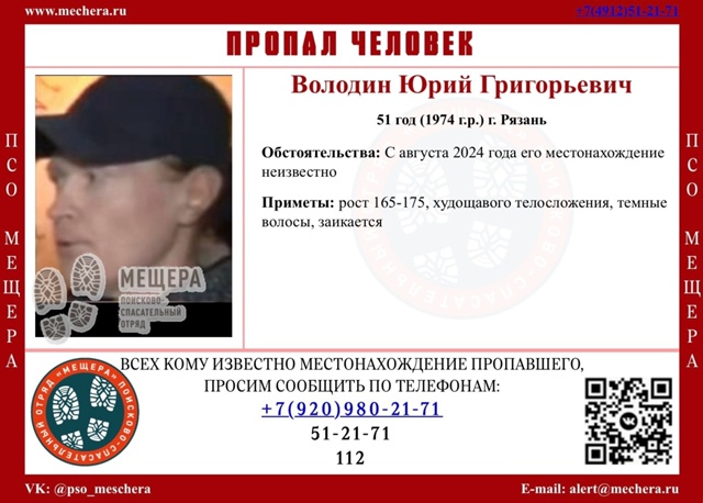 В Рязани ведутся поиски мужчины, который пропал в 2024 году. Ориентировку с приметами опубликовал поисково-спасательный отряд «Мещера».