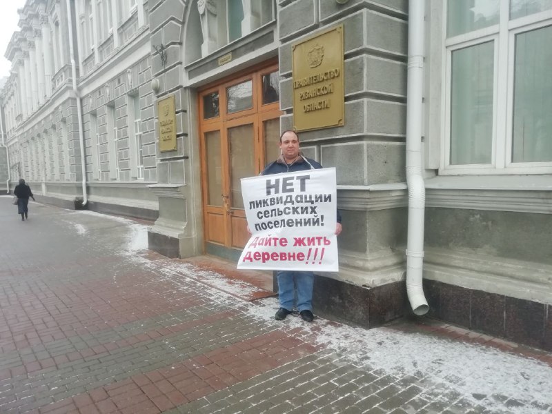 Мужчина выступает против ликвидации сельских поселений. На его плакате написано: «НЕТ ликвидации сельских поселений! Дайте житье деревне!!!».