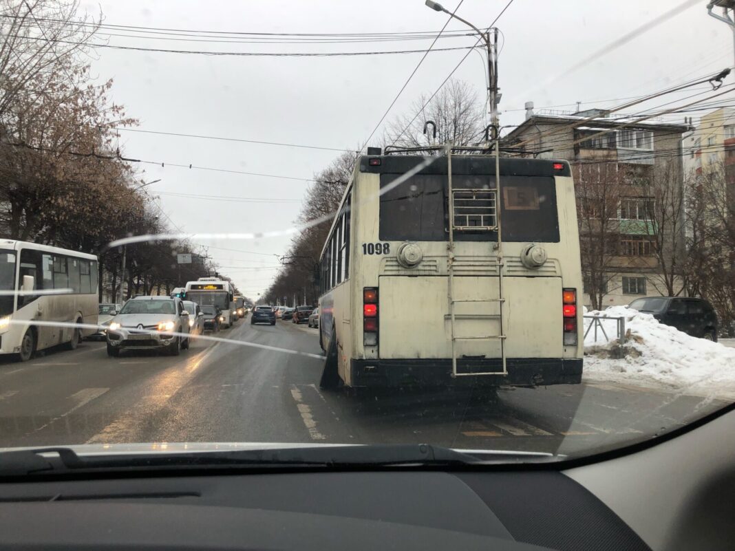 В Рязани у троллейбуса отвалилось колесо. Фото последствий ДТП опубликовала группа «Подслушано у водителей Рязани».