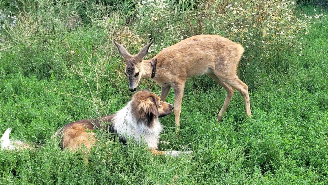 Когда Марта попала в семью, у Елены уже был пес Рекс. С первого дня появления косули в доме он проявлял интерес к новому жителю, но никогда не относился к ней агрессивно. Обнюхивал ее, осторожно привлекал к играм и был, как и хозяйка, всегда рядом. Марта подружилась с Рексом, и теперь они постоянно вместе: они весело играют в догонялки, гуляют вместе с Еленой по селу и даже спят рядышком.