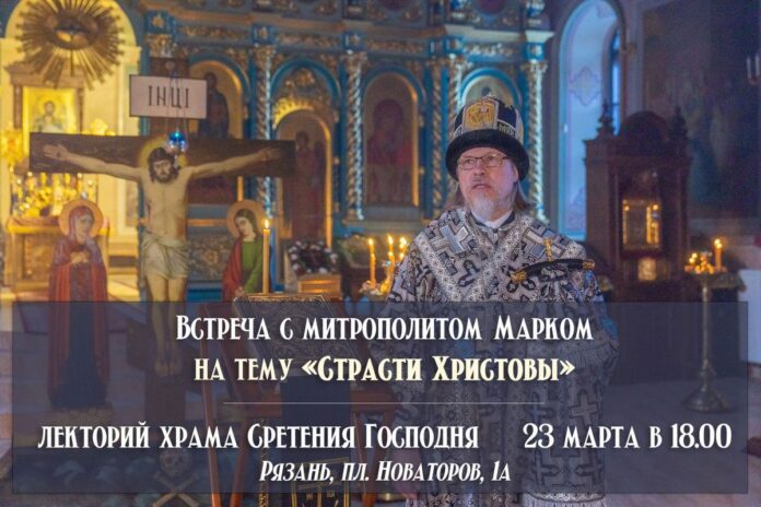 23 марта в 18.00 митрополит Рязанский и Михайловский Марк встретится со слушателями лектория храма Сретения Господня. Тема беседы — «Страсти Христовы». Об этом сообщил сайт Рязанской епархии.
