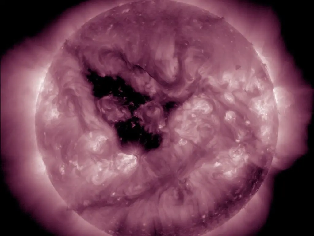 За последние сутки её площадь увеличилась примерно на 50%. Учёные отмечают, что в этой области Солнца должен формироваться особенно быстрый и плотный поток солнечного ветра. Сильное потемнение регистрируется не только в верхних, но и в нижних слоях атмосферы светила — а это происходит крайне редко.