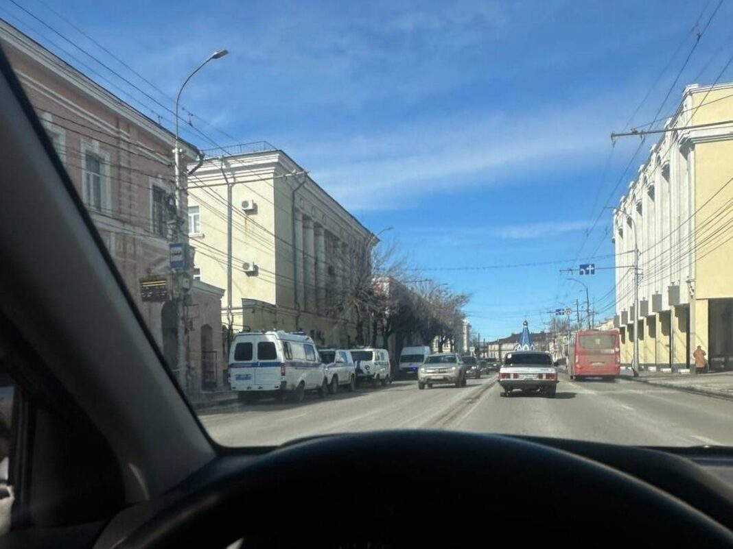 На снимке можно заметить минимум 3 полицейских автомобиля. Они стоят на улице Ленина напротив библиотеки имени Горького с другой стороны дороги.