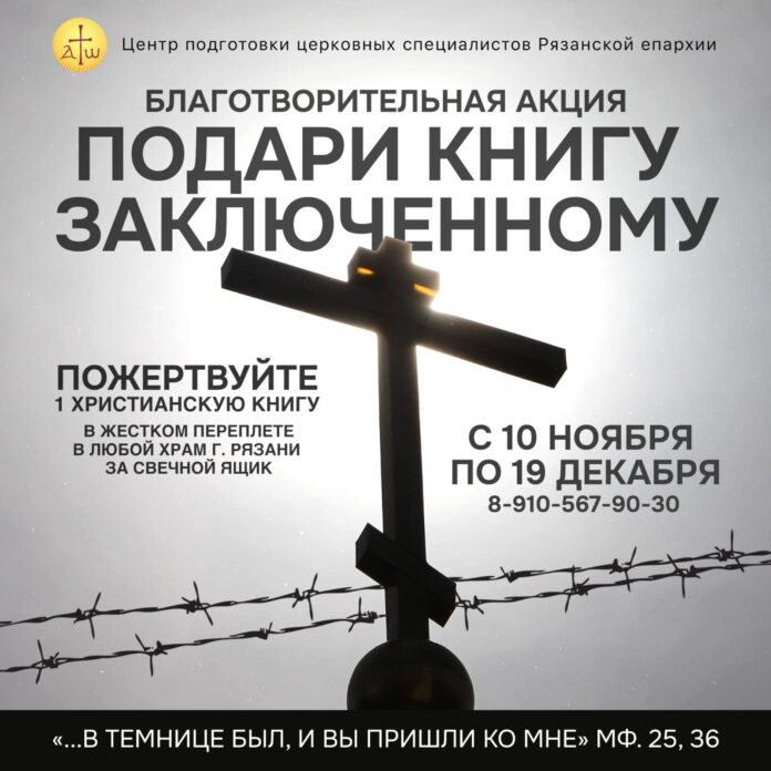 Рязанцев приглашают присоединиться к благотворительной акции «Подари книгу заключенному», которую организует Центр подготовки церковных специалистов Рязанской епархии. Акция проходит с 10 ноября по 19 декабря и приурочена к Дню милосердия и сострадания, отмечаемому 19 декабря в память о святителе Николае Мирликийском, покровителе заключенных.