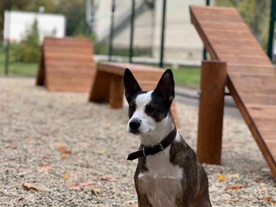 На площадке установлены спортивные снаряды для дрессировки и выгула животных. Территория покрыта современным галечным покрытием, которое обеспечивает хороший дренаж и предотвращает застой воды и грязи в межсезонье. Кроме того, на площадке есть навесы от дождя и скамейки для хозяев животных.