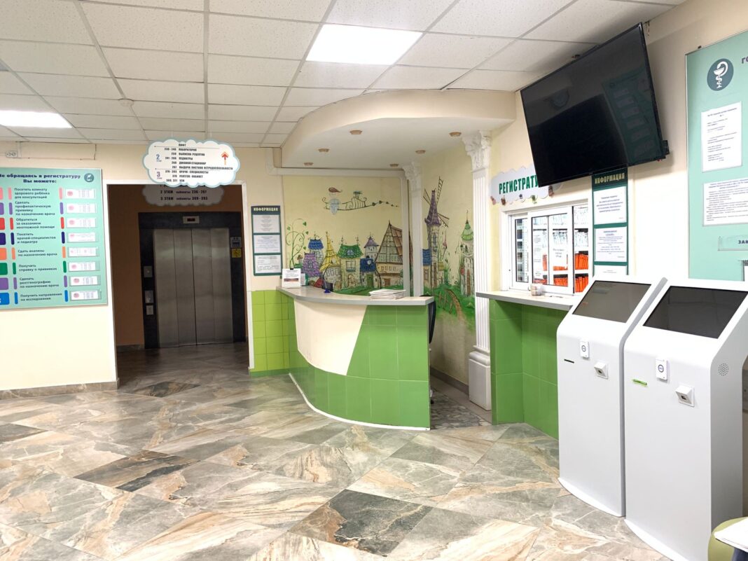 В Городской детской поликлинике №7 два терминала записи расположены в холле отделения для больного ребенка, один инфомат находится в холле здорового детства.
