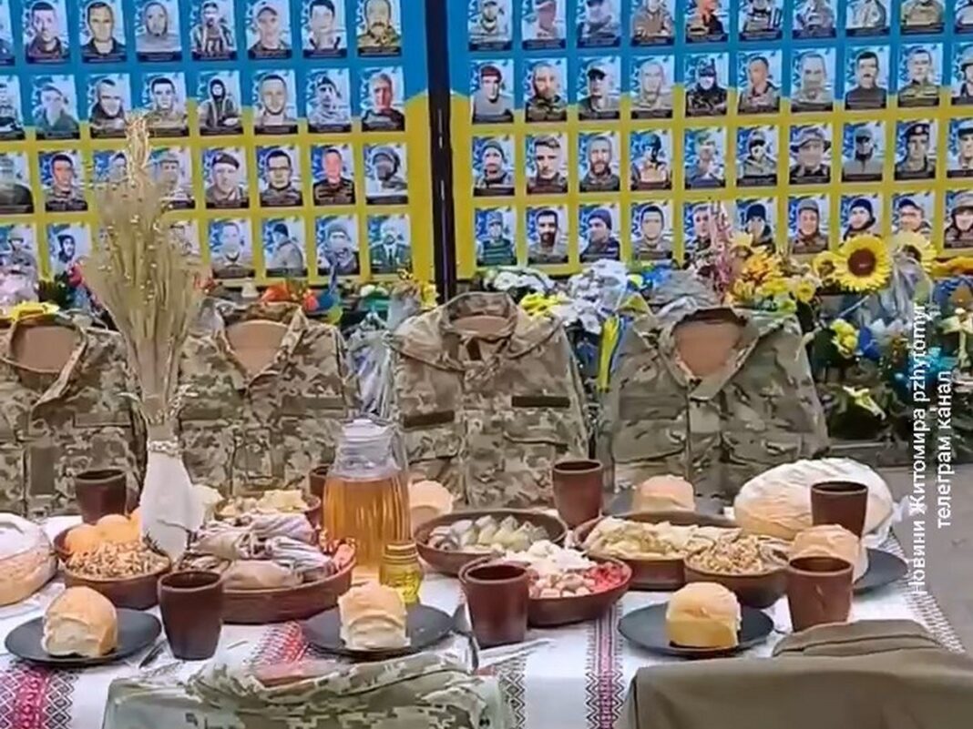 В городе Овруч Житомирской области на воинском мемориале накрыли стол, за которым нет людей. На стульях только военная форма ВСУ. Похоже, что таким образом местные жители поминают погибших солдат.