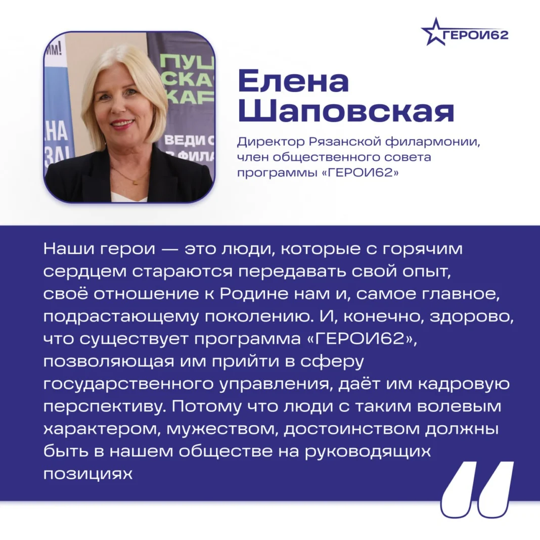 Участники специальной военной операции являются примером для подрастающего поколения, которое видит в них настоящих героев современности. Такое мнение высказала директор Рязанской филармонии, член общественного совета программы «ГЕРОИ62» Елена Шаповская.
